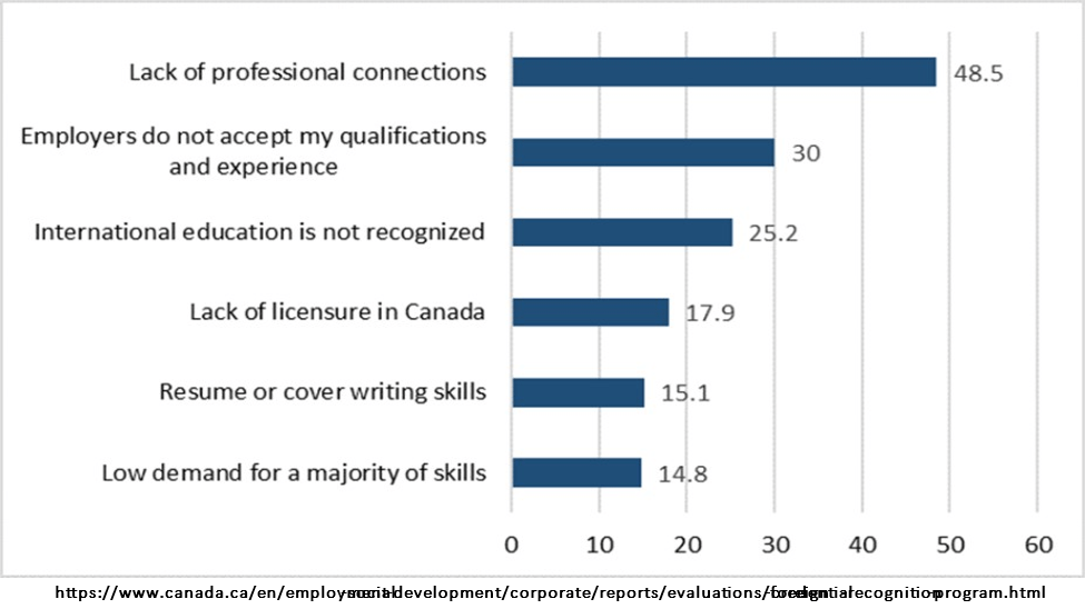 As a result, since they immigrated to Canada, such professional or skills credentials are barely recognized; thus, newcomers grapple with challenges and difficulties in establishing a living. But, again, immigrants must remember that those credentials are for selection purposes only, and successful participation in the labour market is not guaranteed. In this respect, a significant volume of literature validates that most educated immigrants experienced a lack of credential recognition by Canadian employers (Hira-Friesen, 2018a: 37; Hira-Friesen, 2018b: 72; Hande et al., 2019: 721), devaluation of their foreign credentials (Frank, 2013: 76), or lack of recognition of qualifications (Anderson, 2010: 301). Frank describes the obstacles to immigrants’ employment success as structural barriers, considering the devaluation of foreign credentials (Frank, 2013: 76), a systemic exclusion of some immigrants from entering their professions, mainly if certificates are from non-traditional regions of origin like Africa and Asia (Basran and Zong, 1998; Pendakur and Pendakur, 2000; Bauder, 2003; Li, 2003 cited in Frank, 2013: 76-77), and the status of “outsider” hinders newcomers in job success (Kogan, 2004: 447 quoted in Frank, 2013: 81).