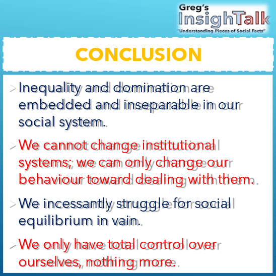 To conclude, we must accept inequality and domination are inseparable elements in the social system. We must also admit that we can not change institutional organizations based on personal philosophy, but we can change our behaviour in dealing with them. At the same time, we incessantly struggle for social equilibrium in vain. As we learned that social realities are external and coercive to people, it is conspicuous and discernable that we only have total control over ourselves, nothing more.